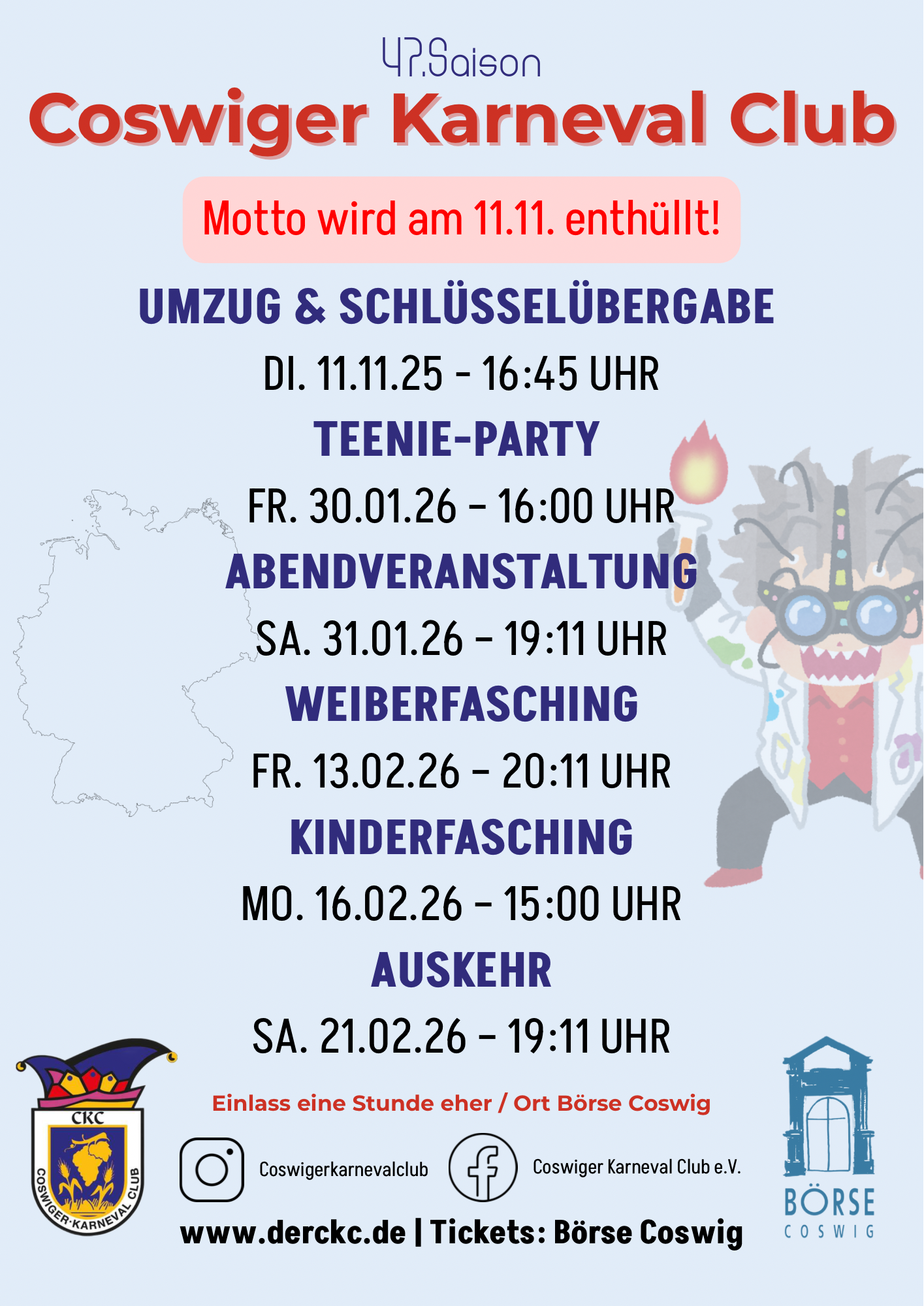 Herzlich willkommen auf der Homepage des Coswiger Karneval Clubs! Hier findest du alles Wichtige über unseren Verein, unsere Veranstaltungen und viele schöne Erinnerungen.